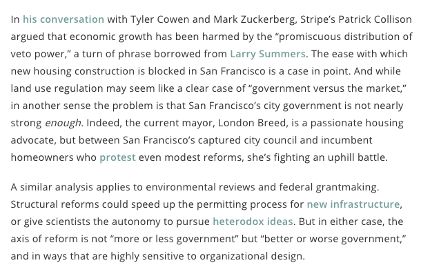 @tylercowen@mgurri@LHSummers and @patrickc have referred to the “promiscuous distribution of veto power" over things like infrastructure and housing construction. But is the problem that San Fransisco's government is too strong, or is it that SF's executive is not nearly strong enough?