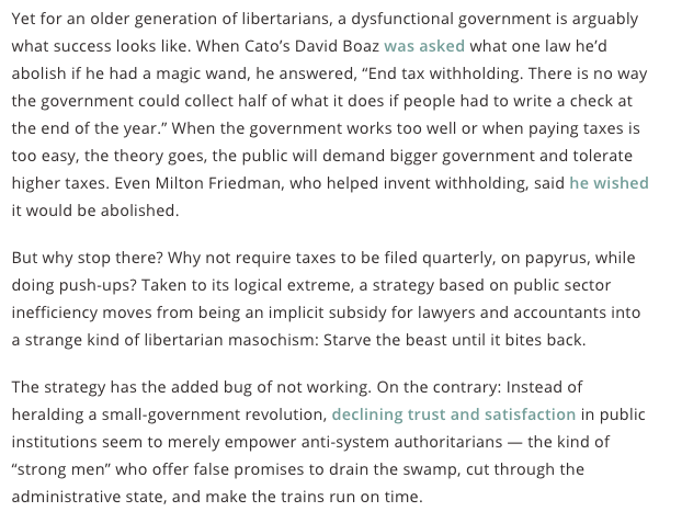 @tylercowen@mgurri An older generation of libertarians promoted dysfunctional government as a strategy; like "culture jamming" but applied to bureaucracy. Taken to its logical extreme, it becomes a strange kind of libertarian masochism. It also doesn't work.