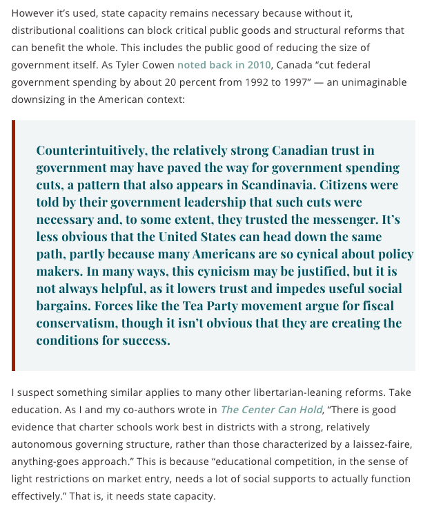 @tylercowen@mgurri@LHSummers@patrickc State capacity is necessary to overcome distributional coalitions that would otherwise block public goods and reforms that benefit everyone. This includes government downsizing! As @tylercowen noted in 2010, high trust in gov't let Chretien cut Canada's federal spending by 20%: