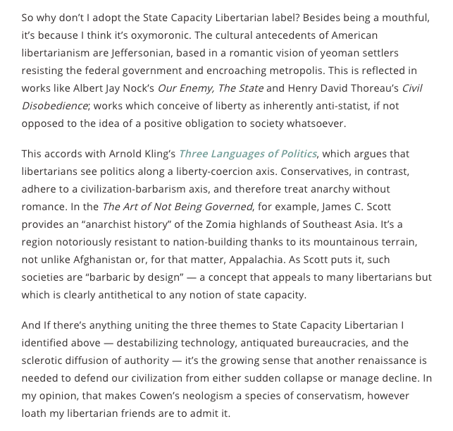 What explains the rise of State Capacity Libertarianism, @tylercowen's umbrella term for folks with pro-market, pro-growth views who nonetheless favor a strong, capable government?