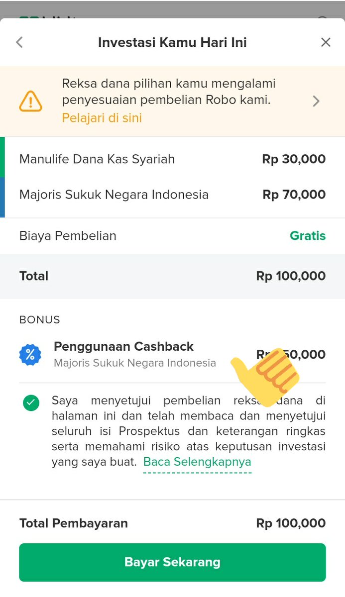 Pakailah metode pembayaran Go-Pay atau LinkAja, jangan transfer manual, karena harus bayar ke 3 Bank Kustodian sesuai unit reksadana yang dibeli dan upload bukti pembayaran satu per satu. Kalau Go-Pay dan LinkAja bayar sekali & tidak perlu upload bukti pembayaran.