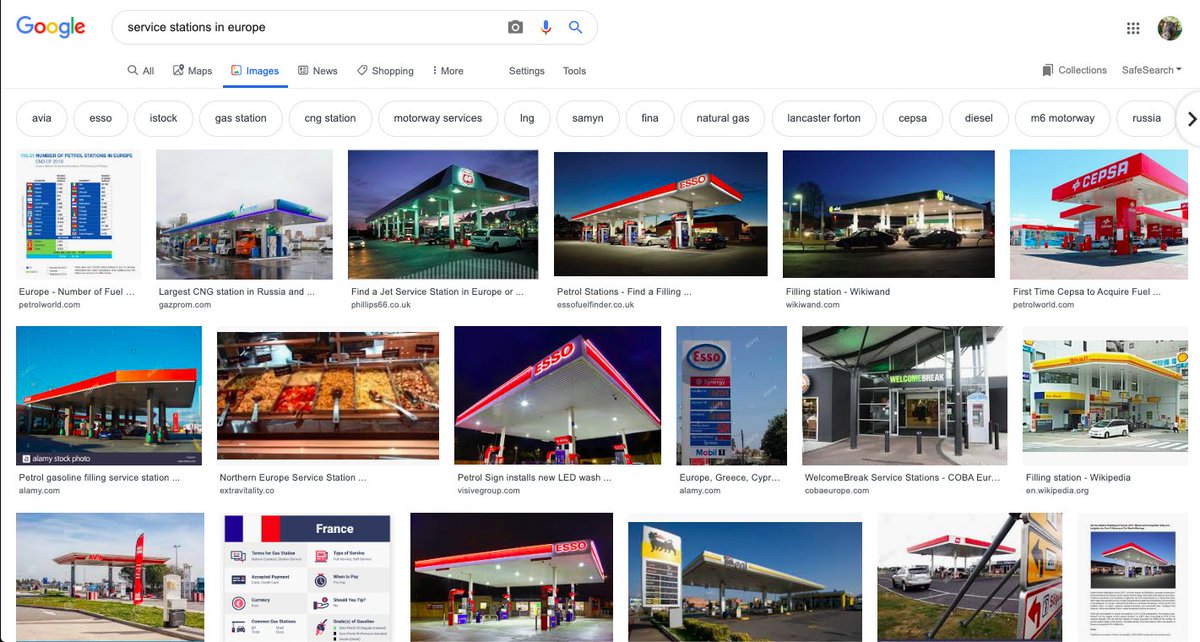 First, the fuel station. From the profile's Twitter timeline we can tell he is traveling toward London and is in Europe. So Googling "service stations in Europe" gives an easy win there.