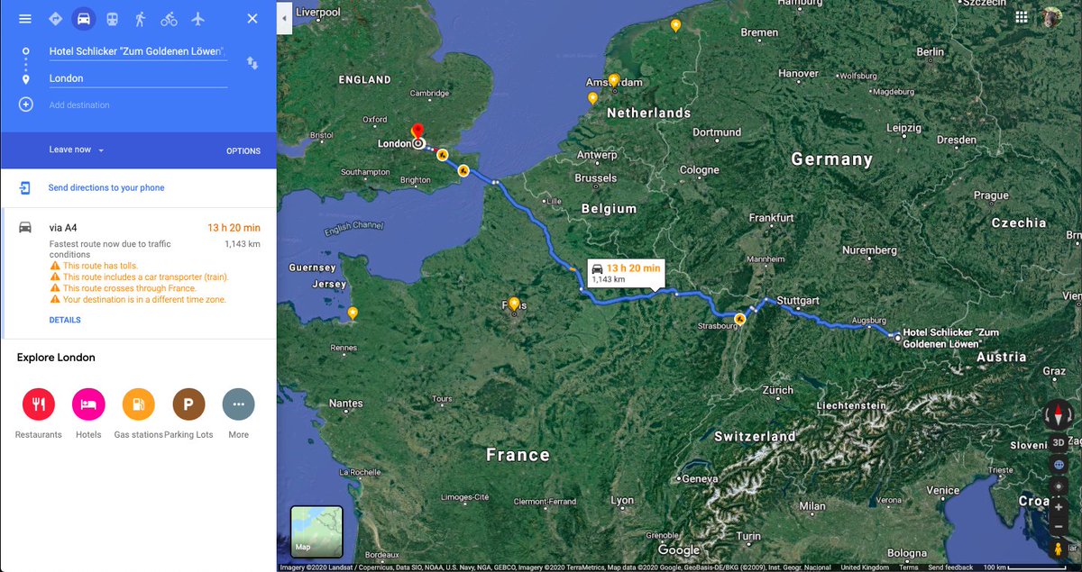 Next - observe activity of timeline. Profile provides information that subject is traveling to London. Where from? In a tweet from the 26th the hotel name "Hotel Schlicken" is present. A suggested path can be made from there to London. google.com/maps/dir/Hotel…