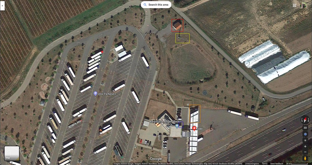 Last - geolocation (confirmation of location). Features are unique to satellite imagery of service station in Baden-Baden, here: goo.gl/maps/LyrQ3yxan….