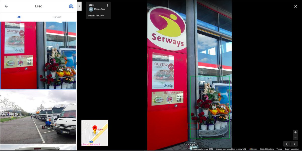 Also niche features of Google Map's geotagged images match such as the flowers, pipe taping and brickwork of the Esso service station in Baden-Baden. google.com/maps/place/Ess…