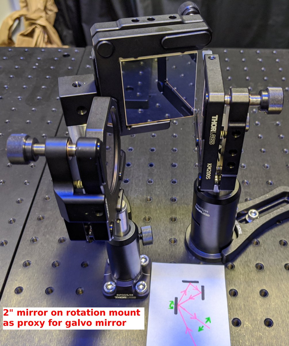 So I rushed home to prototype! I used stock @Thorlabs parts, substituting a 2" mirror for the galvo that I don't have yet.