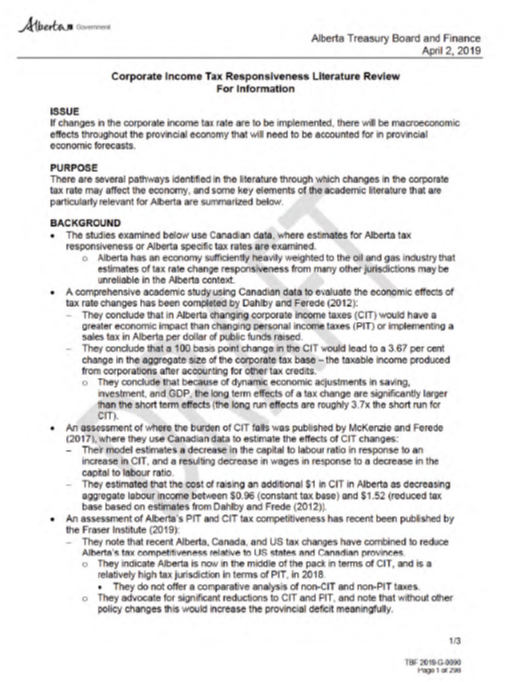 Treasury Board and Finance Officials looked at the @Alberta_UCP election promises and found the studies they relied on “may be unreliable in the Alberta context”.