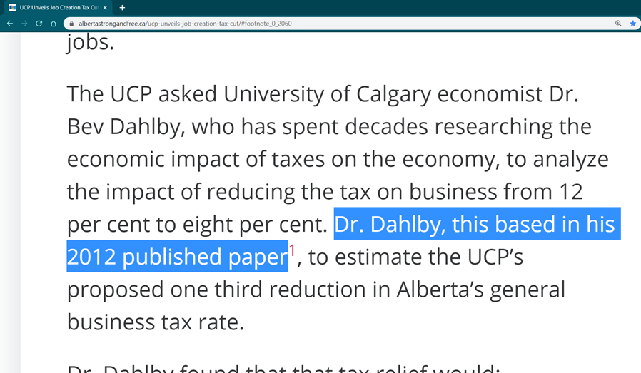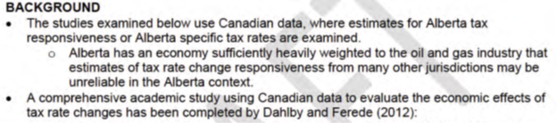 Jason Kenney and the UCP relied heavily on a 2012 study by Drs. Dahbly and Ferede. Their work centred on effects of BC’s corporate tax cut in the mid-2000s, then modelled a theoretical impact across Canada as a whole.