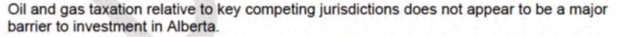 The internal government document also states that “Oil and gas taxation relative to key competing jurisdictions does not appear to be a major barrier to investment in Alberta.”