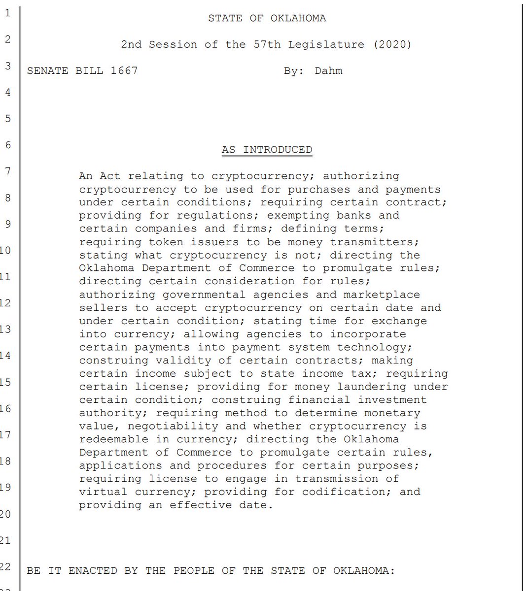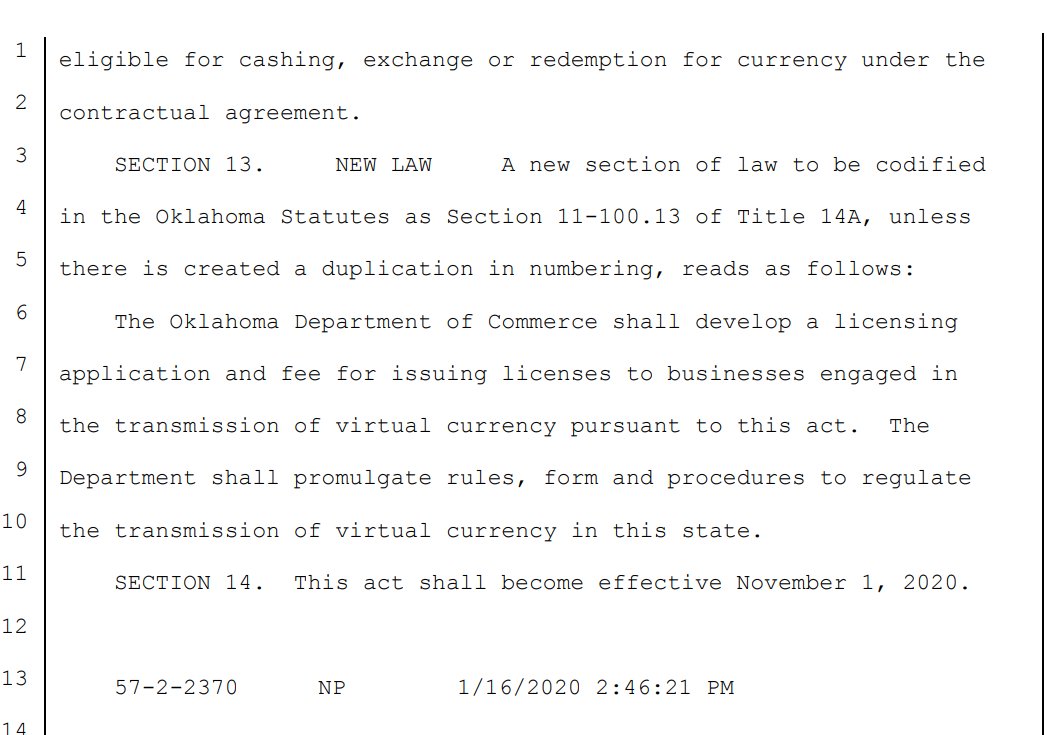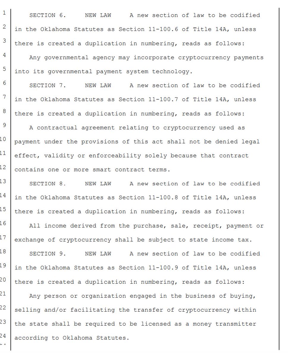 #Oklahoma SB 1667 would authorize #cryptocurrency to be used for purchases under certain conditions; would be permitted to be used, offered, sold, exchanged & accepted as an instrument of monetary value within the governmental agencies of Oklahoma /1