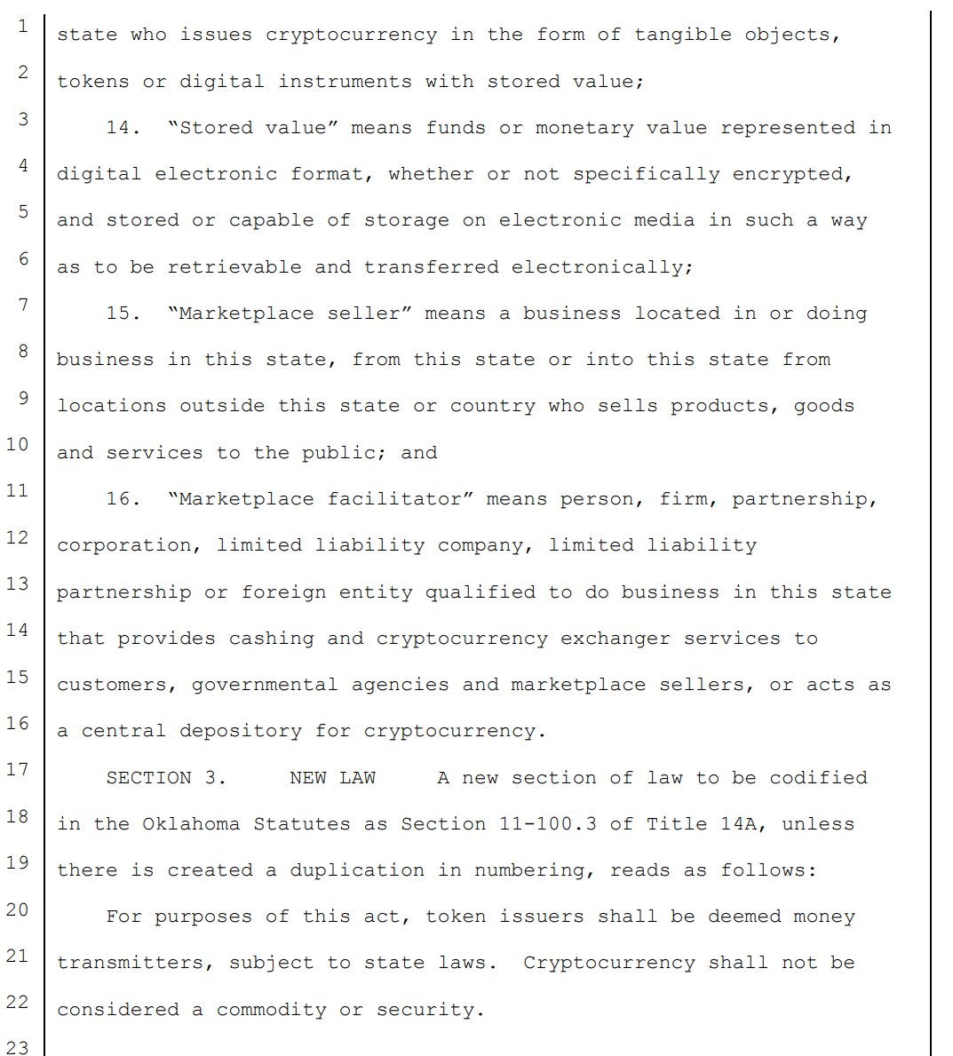 OK introduces its own defintion of "marketplace faciltiator" to mean an entity "qualified to do [biz] in this state that provides cashing & #cryptocurrency exchanger services to customers, govt agencies & marketplace sellers, or acts as a central depository for cryptocurrency."