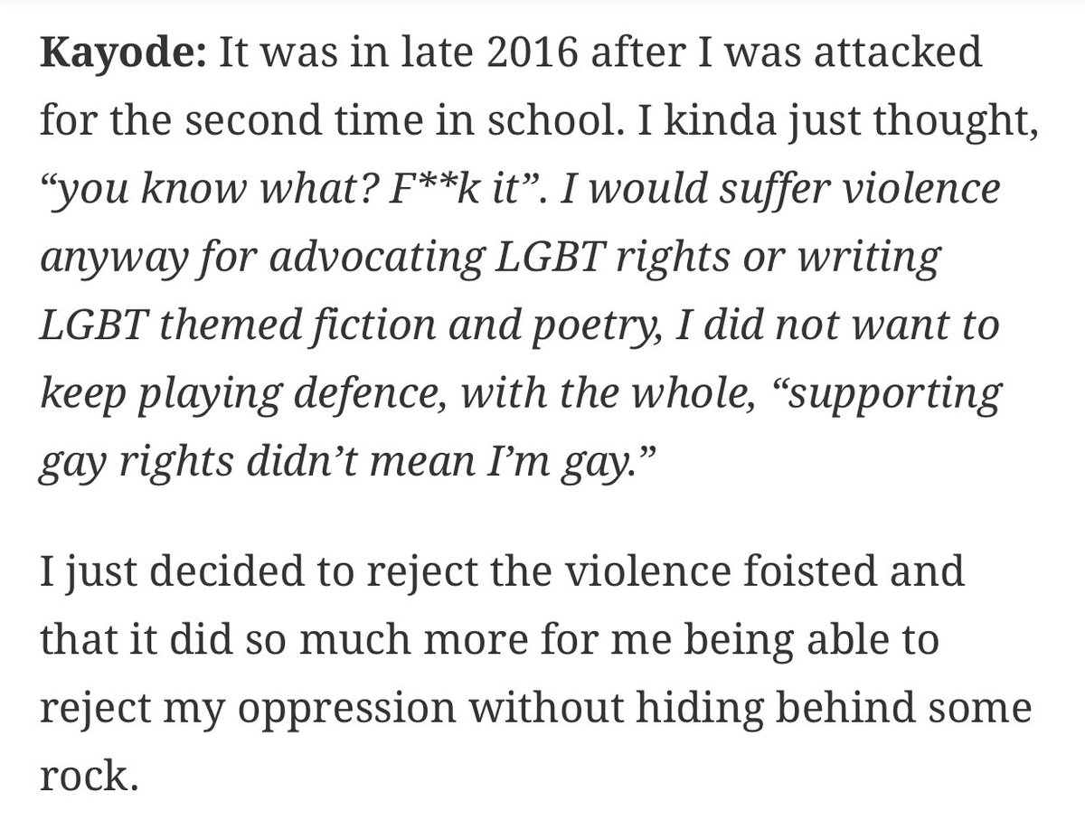At what point did you decide to be openly gay? “It was in late 2016 after I was attacked for the second time in school. I kinda just thought, “you know what? F**k it”. I would suffer violence anyway for advocating LGBT rights or writing LGBT themed fiction and poetry,” Kayode Ani