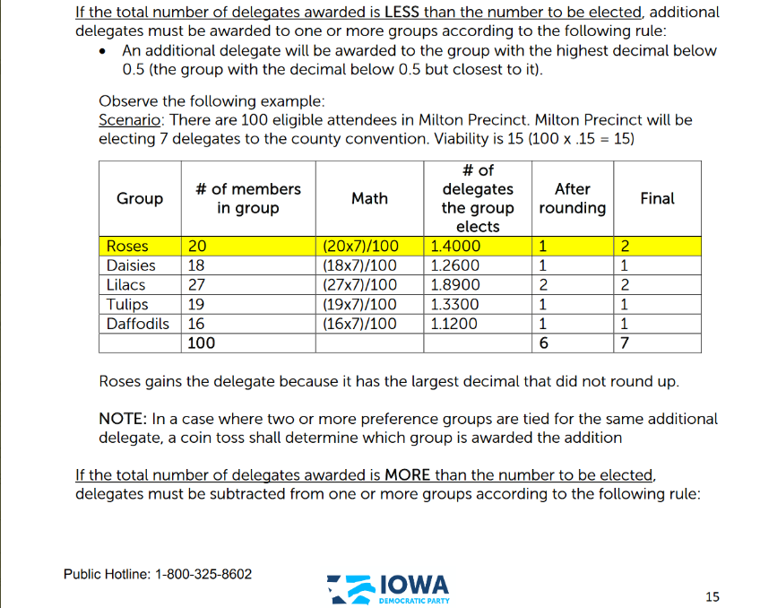 You need to assign all delegates; if there's one left (which is possible since you're dividing based on all attendees), you round up to candidate with biggest remainder (even if they're under '.5').