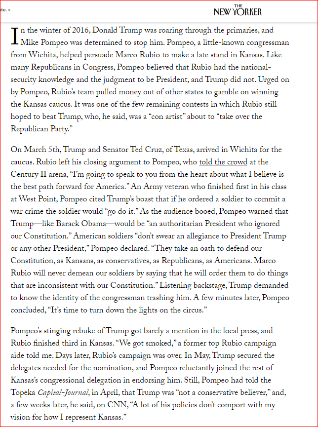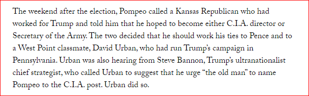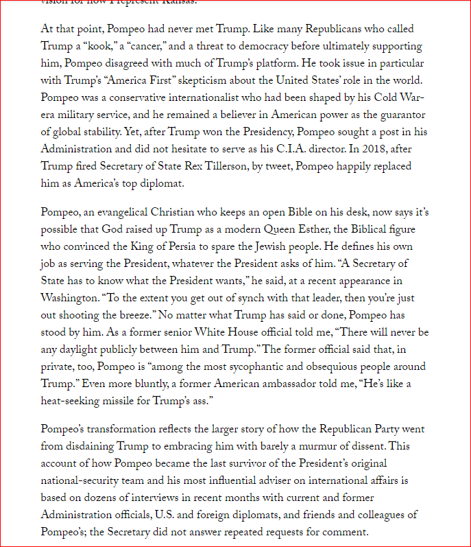 "This account of how Pompeo became the last survivor of the President’s original national-security team & his most influential adviser on international affairs"...