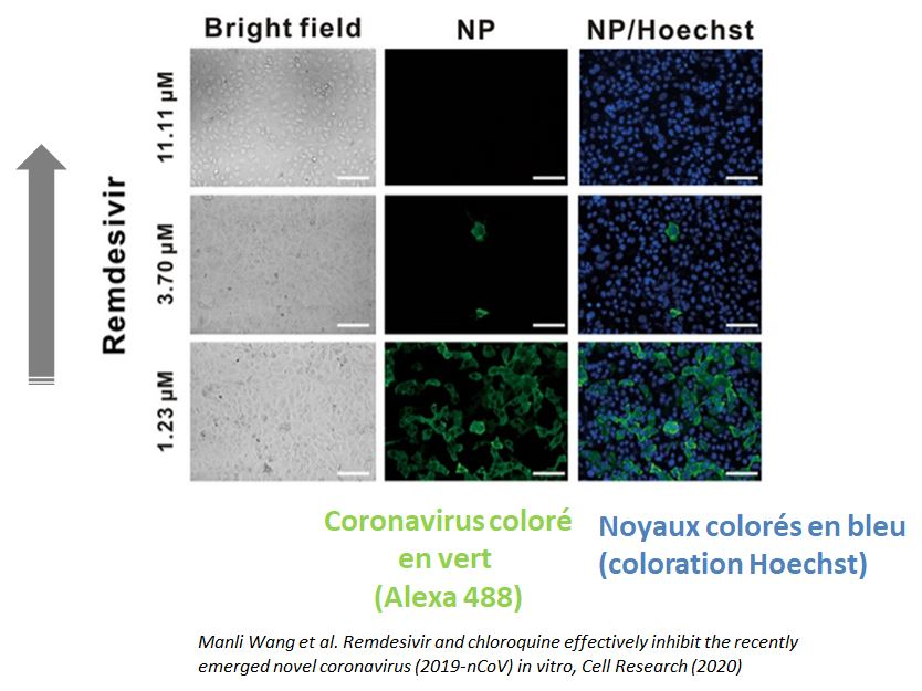 Une analyse in vitro a constaté que le remdesivir et la chloroquine sur des cellules (Vero E6) infectées par le #2019nCoV (coloré en vert) sont efficaces à faibles doses comme agents antiviraux