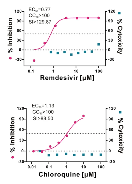 La chloroquine fait augmenter le pH des endosomes et empêche la fusion virus/cellule). Ces 2 antiviraux ont bloqué l’infection virale à de faible concentration (concentration efficace mi-maximale (CE 50 = 0,77 μM et 1,13 μM respectivement)