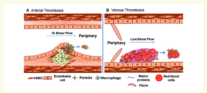 Veins > low shear stress > fibrin/RBC-rich clots > anticoagulation therapy
