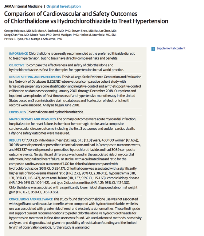@OHDSI@suchard_group@PCORI We concluded: 'chlorthalidone use was not associated with significant cardiovascular benefits when compared with hydrochlorothiazide, while its use was associated with greater risk of renal and electrolyte abnormalities.’ @JAMAInternalMed
