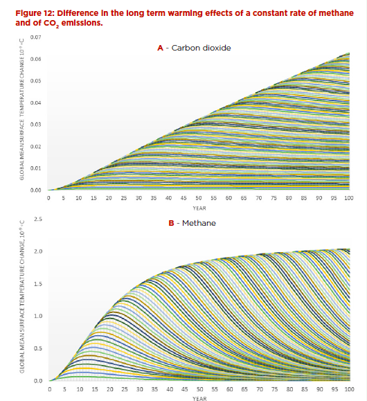 Compare the global warming contribution of methane under a scenario of +1% annual increase (left) vs. steady emissions (right).