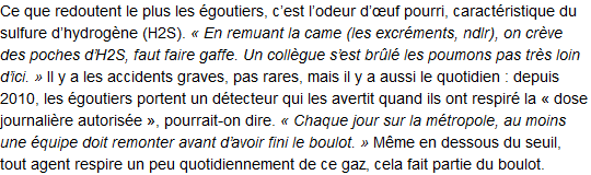 « En remuant [les excréments], on crève des poches d’H2S, faut faire gaffe. Un collègue s’est brûlé les poumons. » Les accidents graves ne sont pas rares. Depuis 2010, les égoutiers portent un détecteur qui les avertit quand ils ont respiré la «dose journalière autorisée»