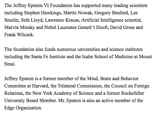 Scientists Jeffrey Epstein supported in 2015, "Stephen Hawkings, Martin Nowak, Gregory Benford, Lee Smolin, Seth Lloyd, Lawrence Krauss, Artificial Intelligence scientist, Marvin Minsky and Nobel Laureates Gerard 't Hooft, David Gross and Frank Wilczek. " jeffreyepstein.org/Jeffrey_Epstei…