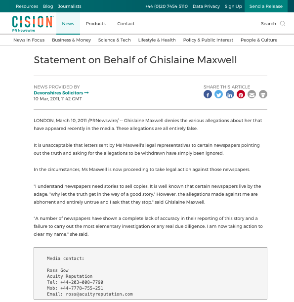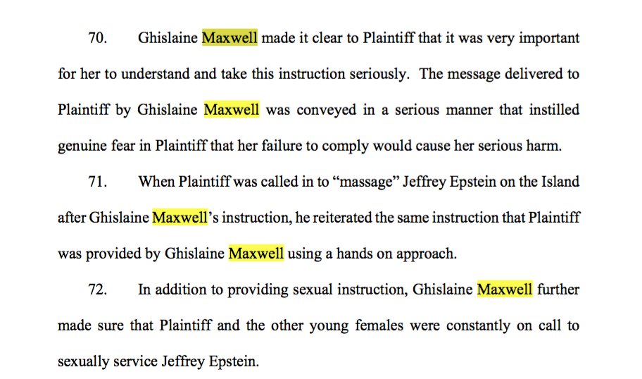 From a court document filed on 8/20/19 Priscilla Doe states, "Ghislaine Maxwell further made sure that Plaintiff and the other young females were constantly on call to sexually service Jeffrey Epstein."
