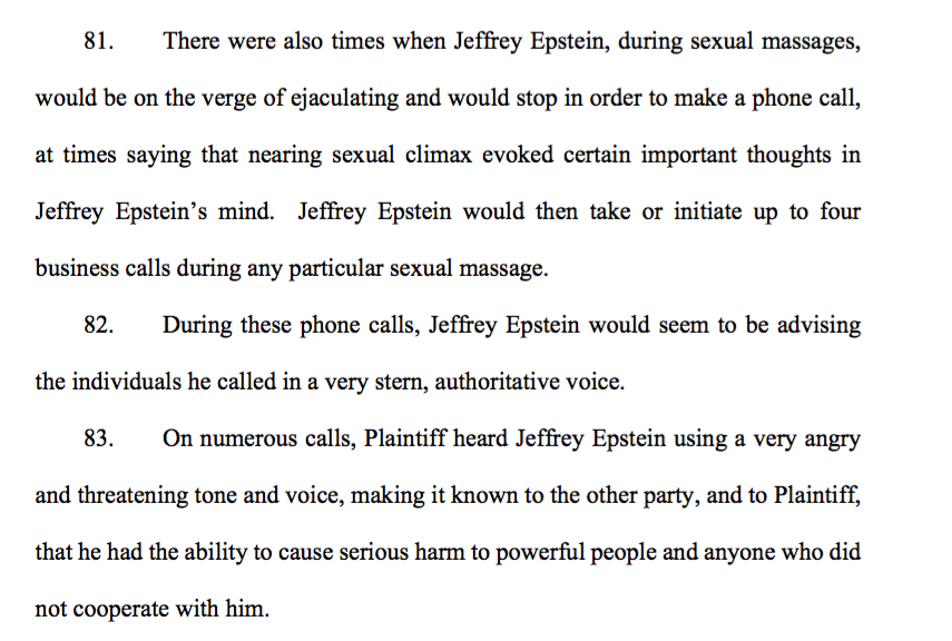 On Epstein: "During sexual massages, would be on the verge of ejaculating and would stop in order to make a phone call, at times saying that nearing sexual climax evoked certain important thoughts in Jeffrey Epstein’s mind."