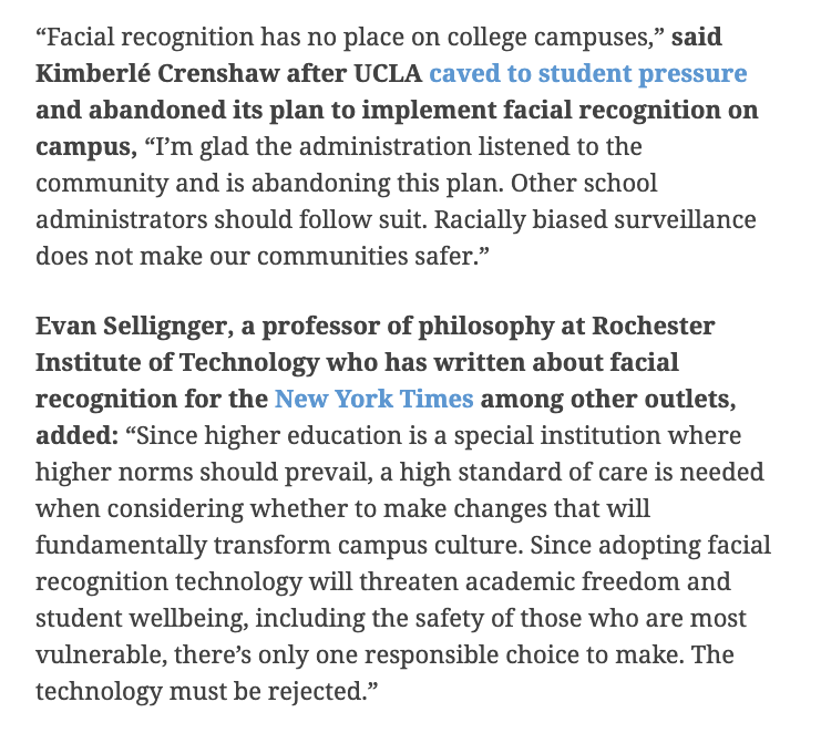 NEW: 150+ college and university professors, faculty, staff, and researchers have penned an open letter echoing student demands to keep #facialrecognition surveillance off of school campuses. It comes days before a national day of action planned for Monday onezero.medium.com/an-open-letter…