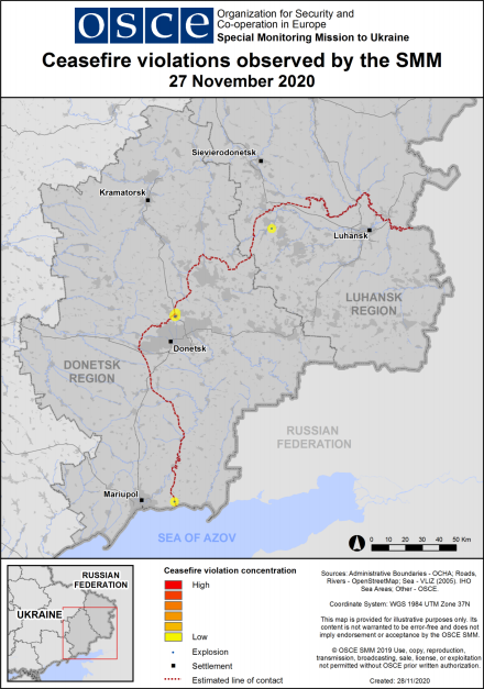 #Ukraine 🇺🇦 | Selon le dernier rapport de l'OSCE, la ligne de front a été relativement calme ces derniers 30 jours. Ici une carte des violations du cessez-le-feu qui ont eu lieu le 27 novembre.