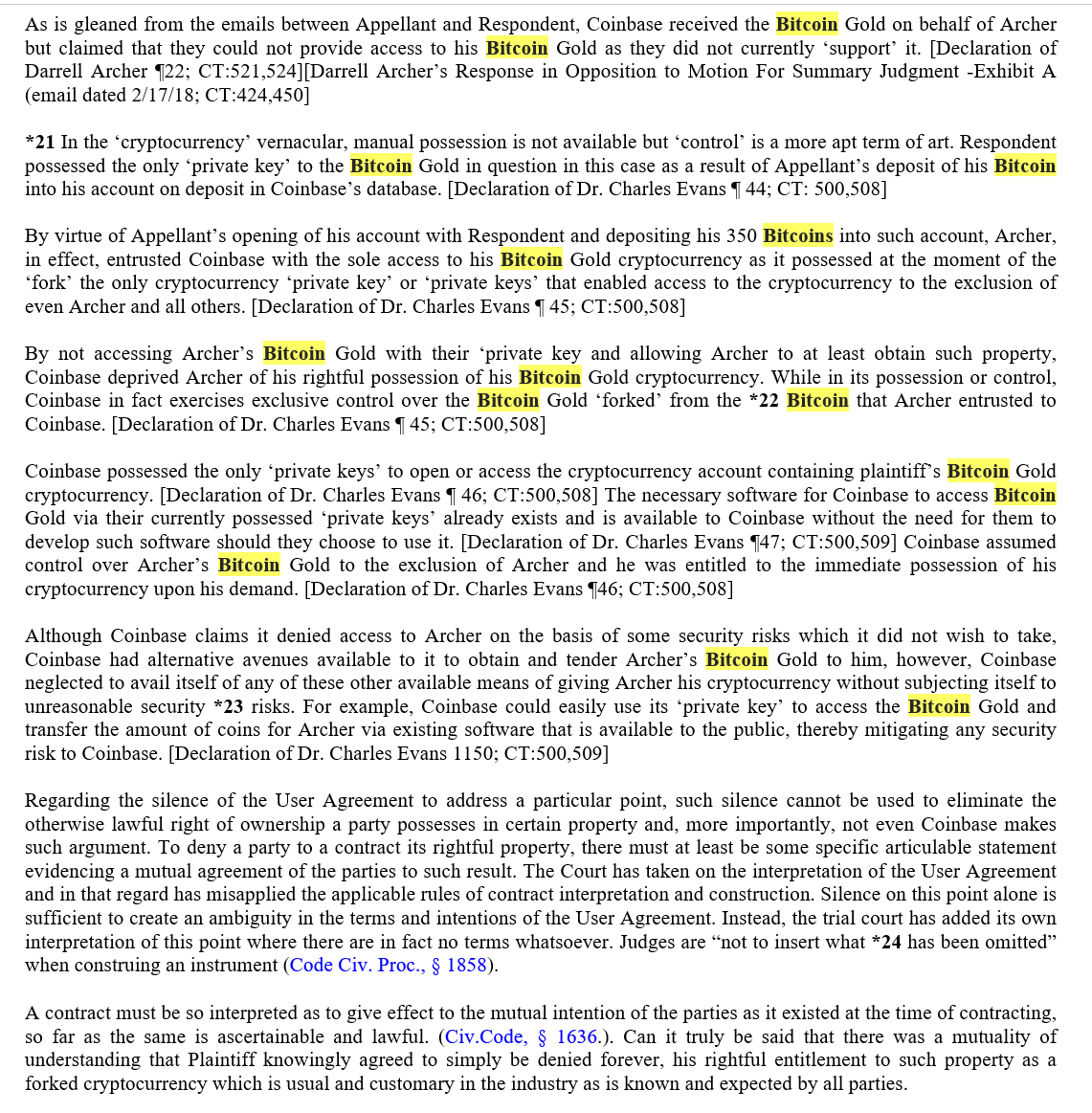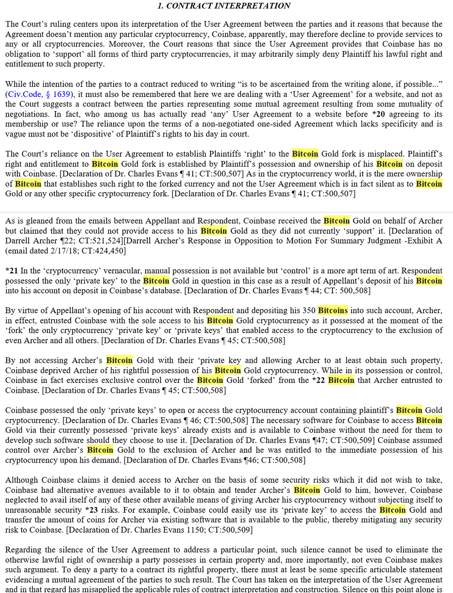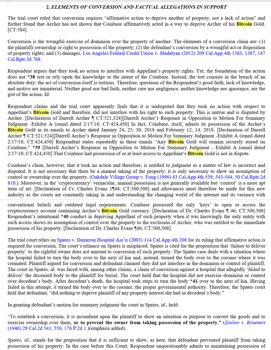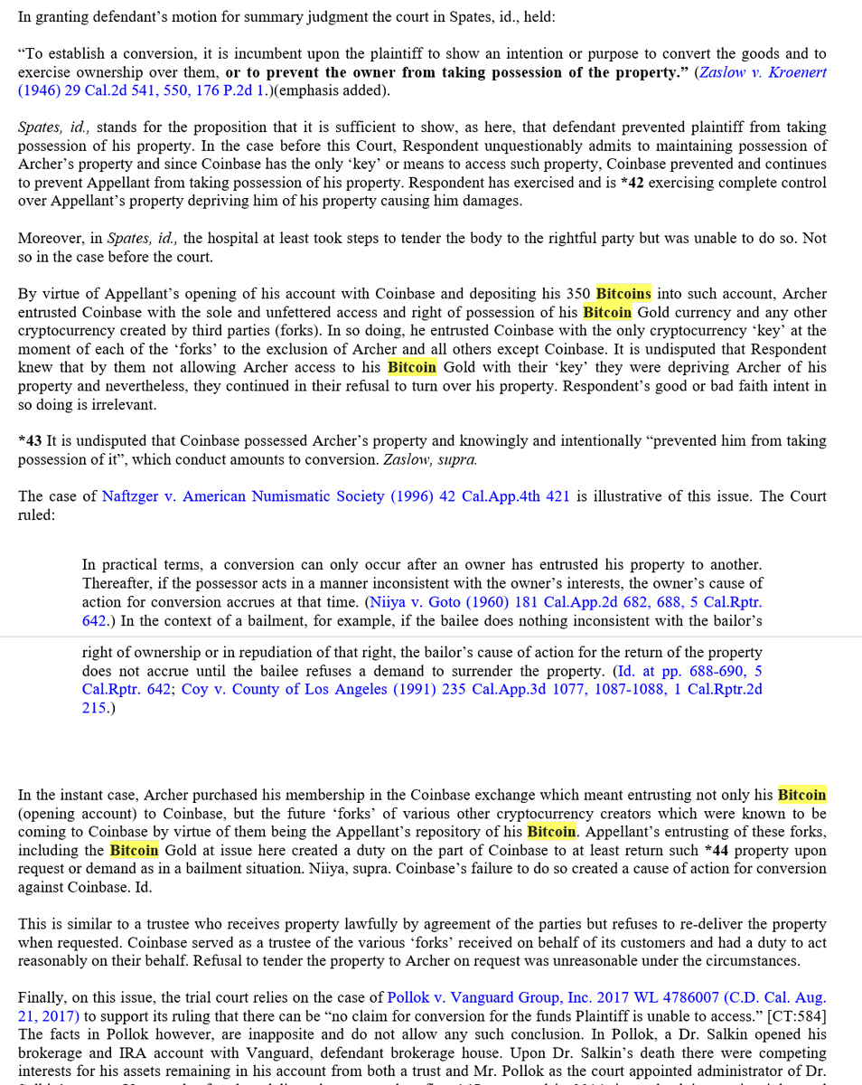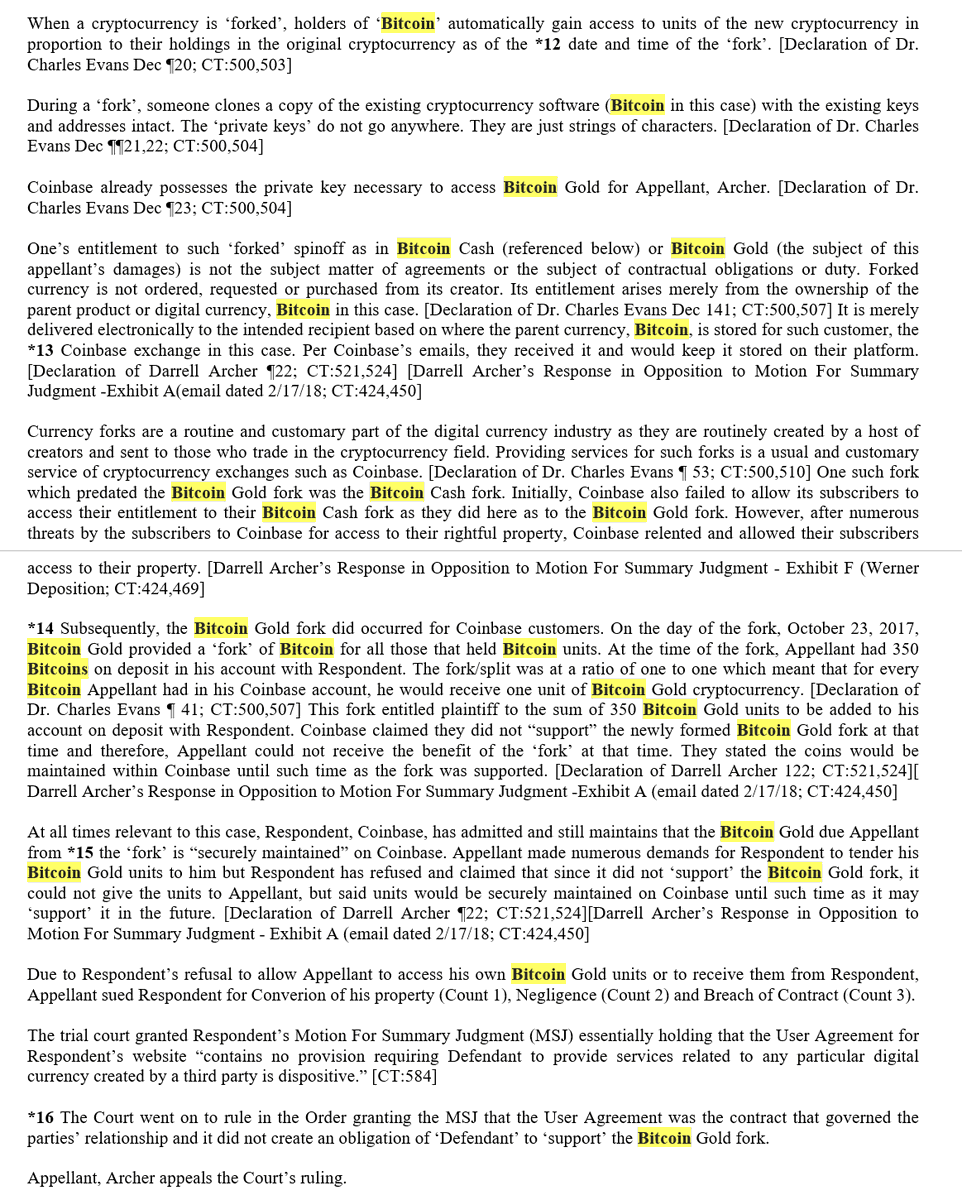 Appeal of summary judgment entered in favor of Coinbase in Archer v. @coinbase case regarding #bitcoin and @bitcoingold fork; complaint alleged conversion, negligence & breach of contract related to non-recognition of BitcoinGold fork; all claims dismissed on summary judgment/1 ImageImageImageImage