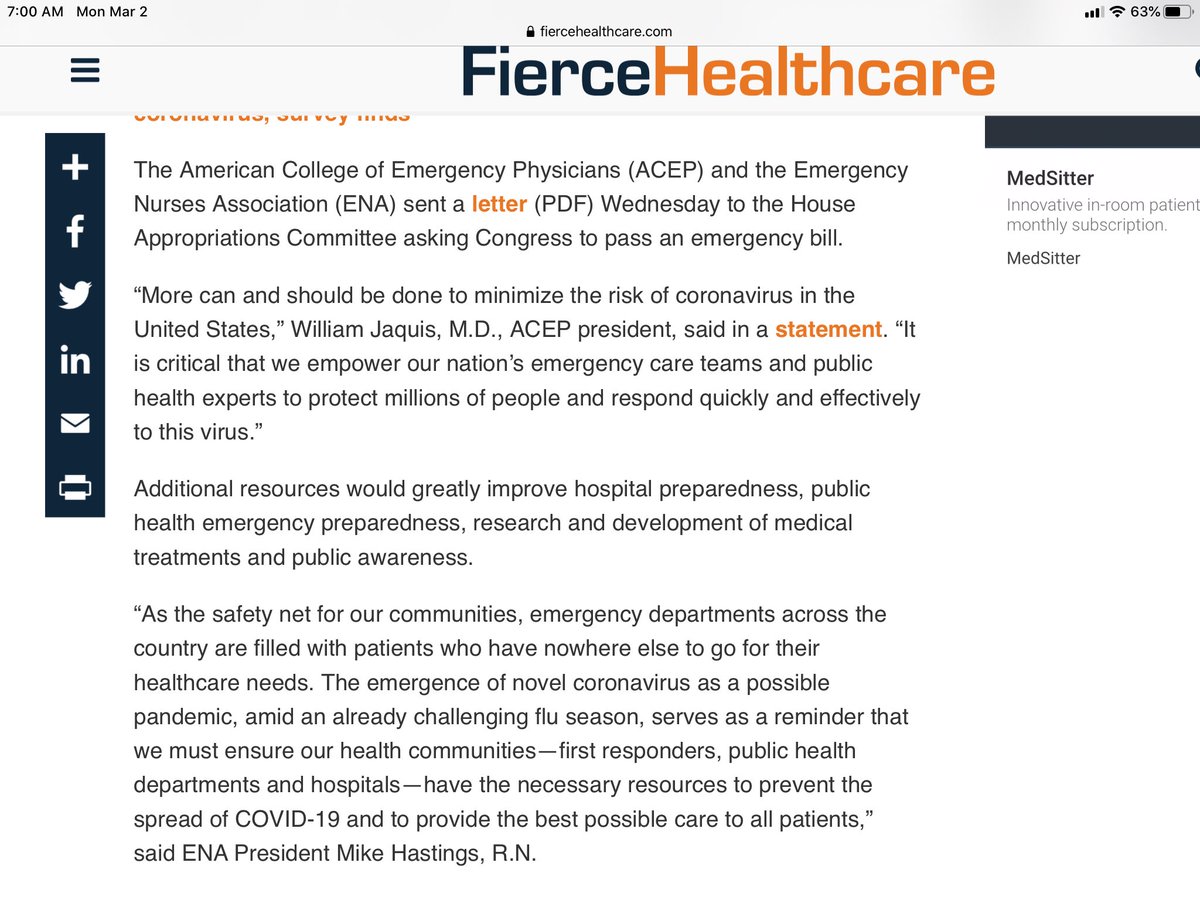 With #ED volumes up mid teens in Q4 2019 as a recent example & reports of influenza rampant in depts. Q1 2020, @emergencyphysicians have been sounding the alarm about surge capacity for some time & time for Congress to act. #hospitalslnkd.in/eMwvD9V