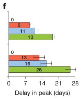 Impact of school closure is usually felt to be higher, but it must occur very early. So: delay in pandemic from *reactive* school closures (closing 100% of schools & 10% of workplaces from day after first case until 3 wks after last case) is in red; with 50% workplaces in blue 4/ Image