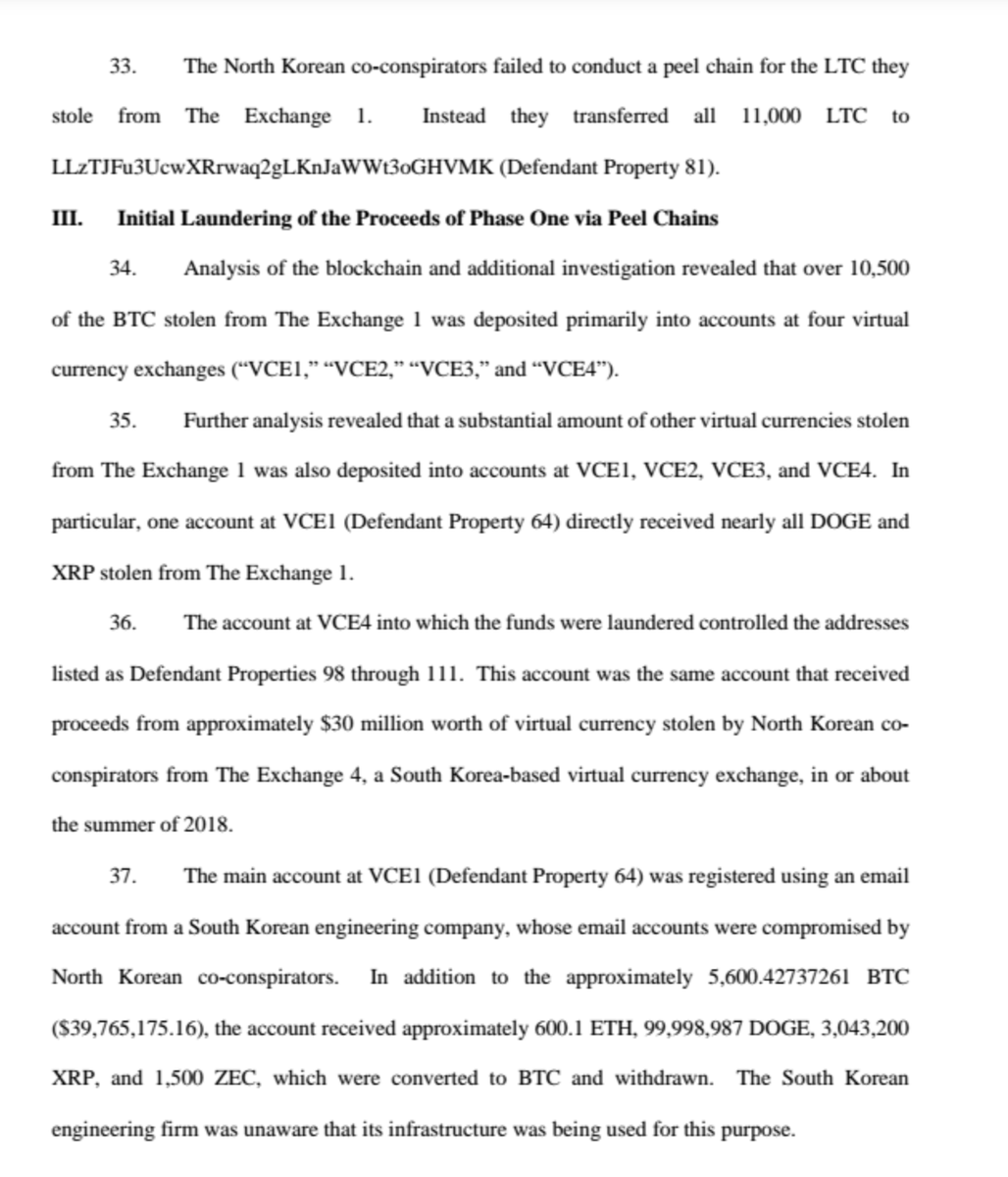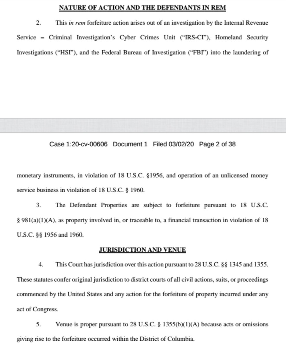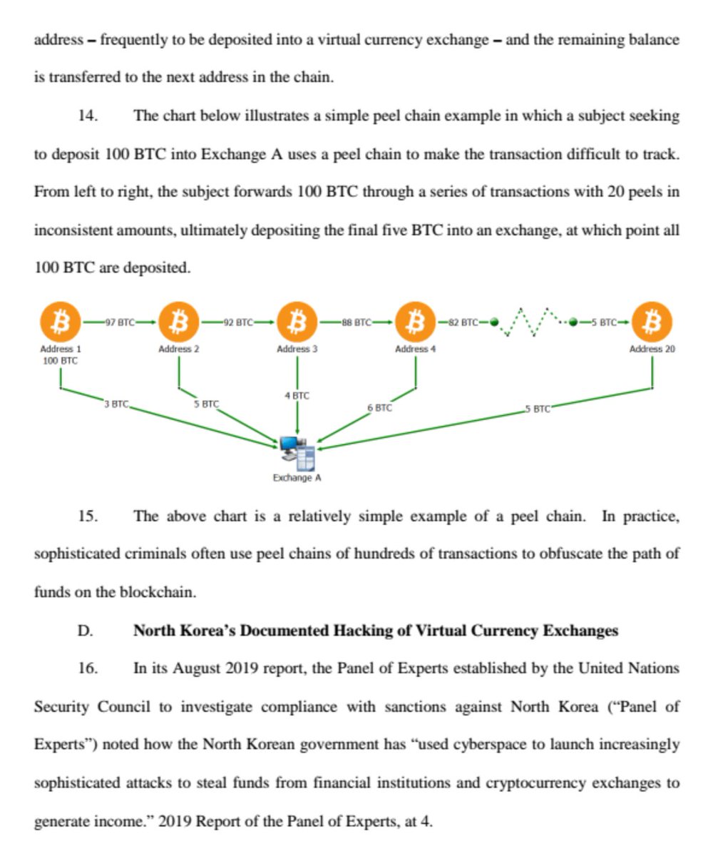 US brings In rem forfeiture claim vs. 113 #cryptocurrency accounts based on an investigation by @IRSnews , @DHSgov & @FBI into money laundering/MSB violations; alleges "peel chain" (new term!) transactions used by North Korea to disguise funds; details NK hacks of exchanges/1