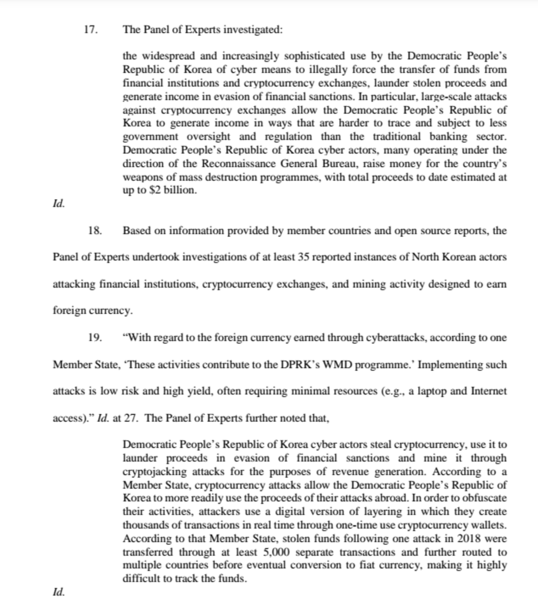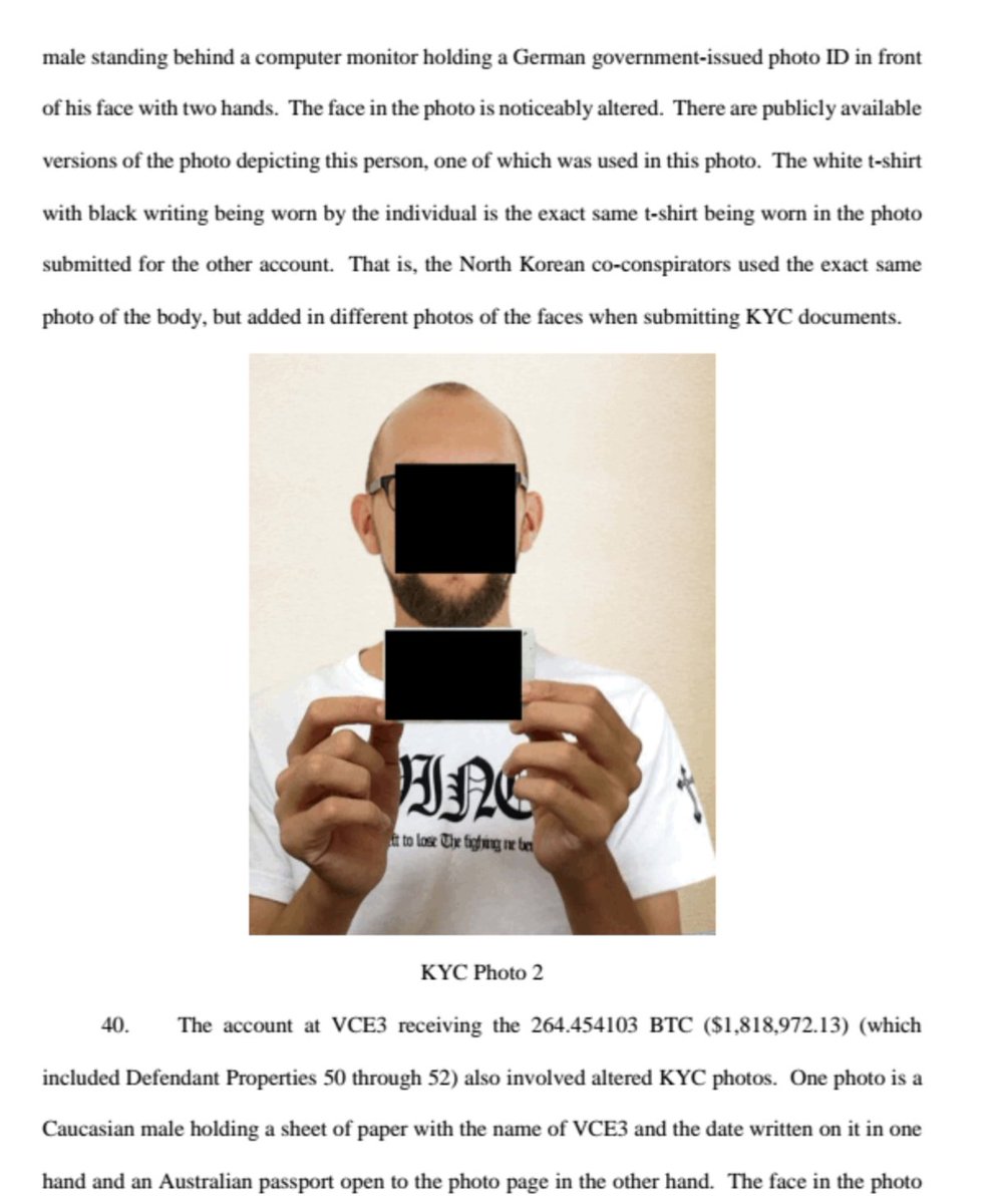 used to steal customer #crypto/funds, resulting in value ($234mm) transferred via other exchanges eventaully to NK, allegedly used to develop WMDs. Alleges altered photos used to game AML/KYC (both worse the same shirt, lol), /2