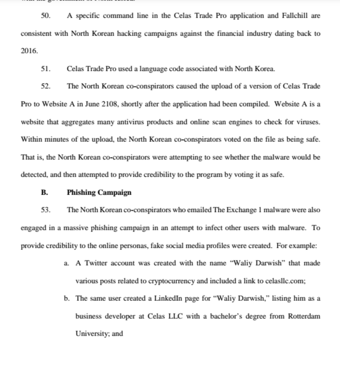 Alleged that stolen funds used to deploy fake businesses used to deploy more malware known to be related to NK /start a phishing campaign; The entire complaint is worth a read, look at the sophistication of the operation & the quality forensics used by the Government. Damn.