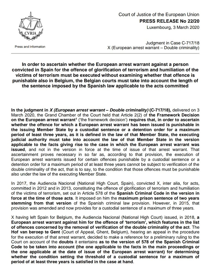 New judgment in controversial European Arrest Warrant case: Spanish EAW issued for rapper convicted of "glorification of terrorism" due to song lyrics referring to violence will be harder to execute in Belgium.