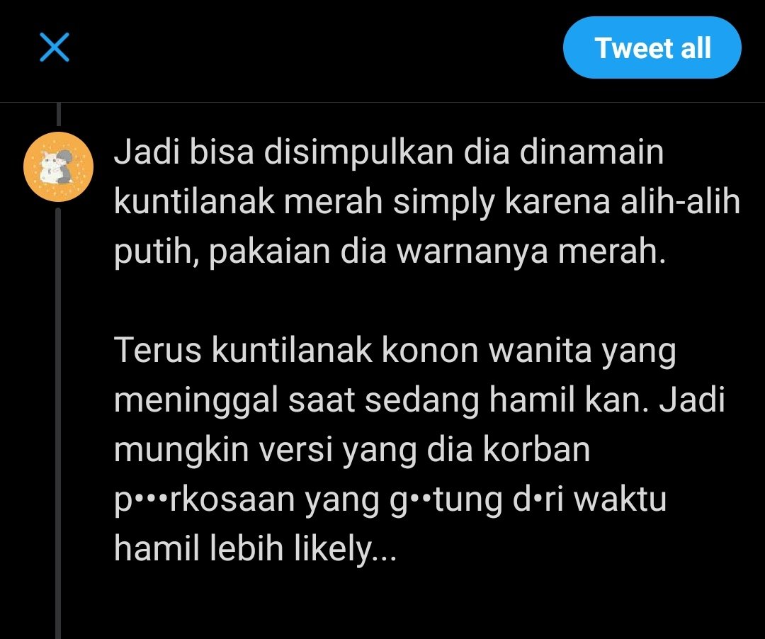 Ada yang bilang dia kuntilanak tapi dasternya merah, ada juga yang bilang dia alih-alih pakai daster polos ala Kuntilanak, pakainya kebaya warnanya merah.