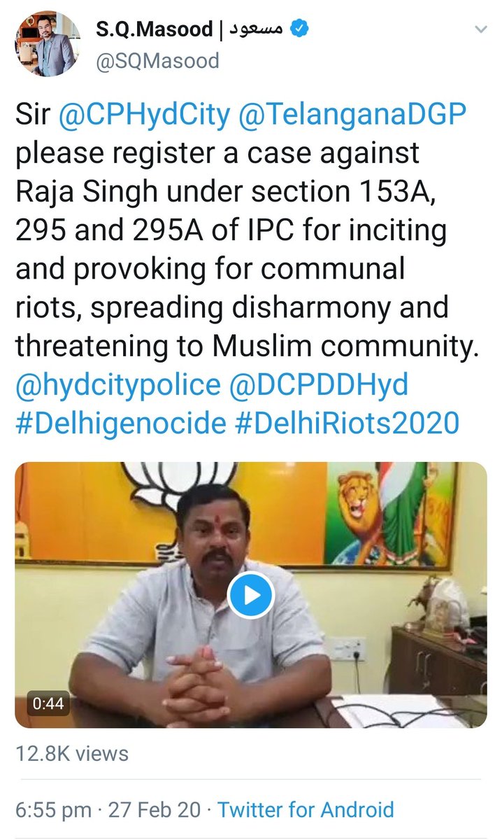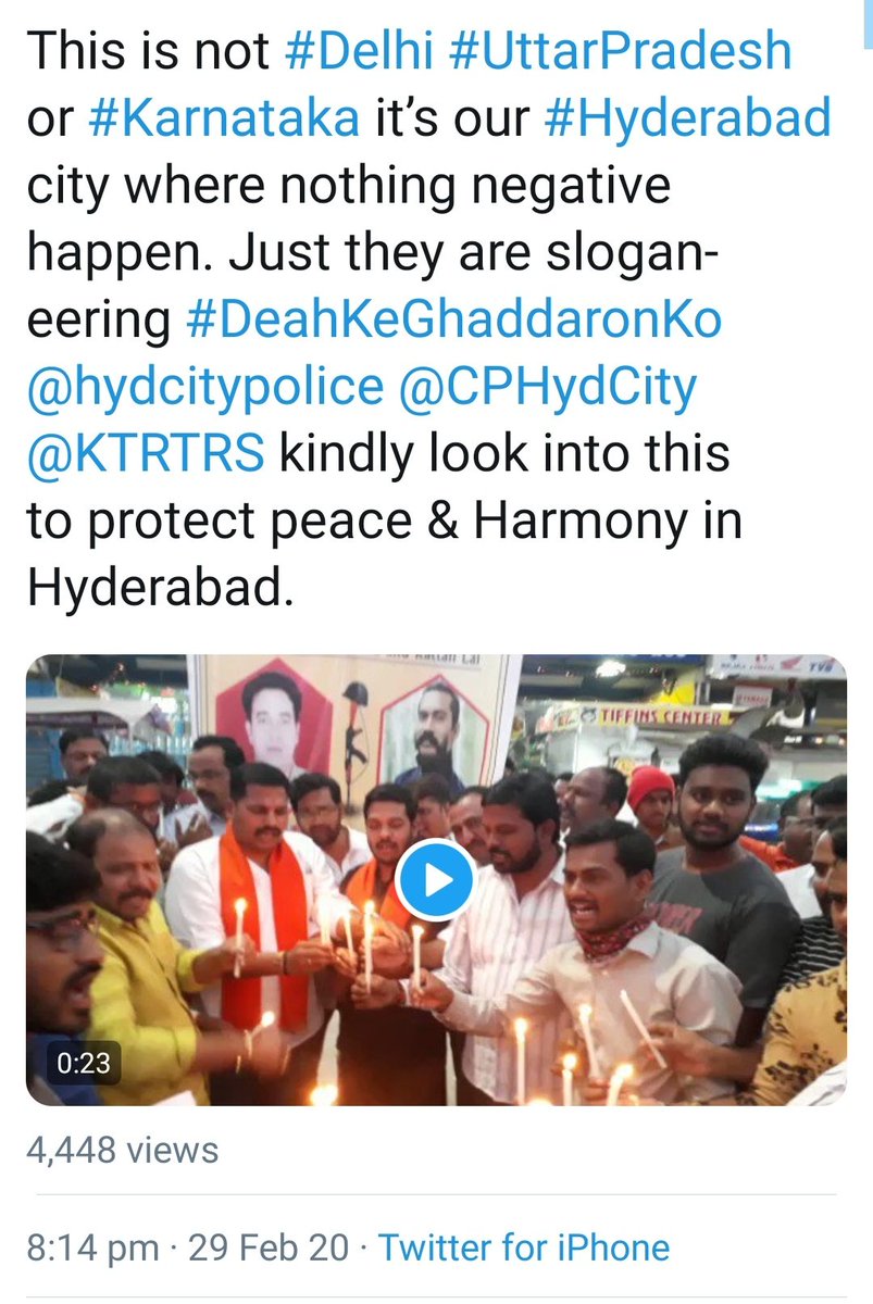 I demand that Mr Anjani Kumar @CPHydCity book cases, and arrest those who have shouted the slogans, release Rahmat and assure him that no harm will befall him, his family and the city.
