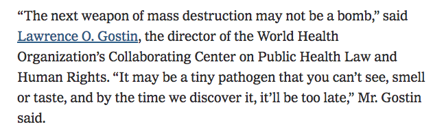 “The next weapon of mass destruction may not be a bomb. It may be a tiny pathogen that you can’t see, smell, or taste, and by the time we discover it, it’ll be too late.”