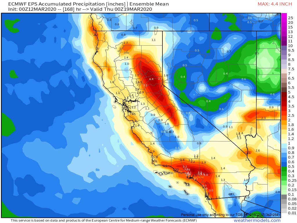 Over the next 5-7 days, a pretty broad swath of 2-3 foot snowfall is possible across Sierra Nevada. This will be a cold system, so accumulating snowfall possible down below 2,500 ft. Rainfall accumulations elsewhere will be fairly widespread and mostly moderate. (2/3) #CAwx