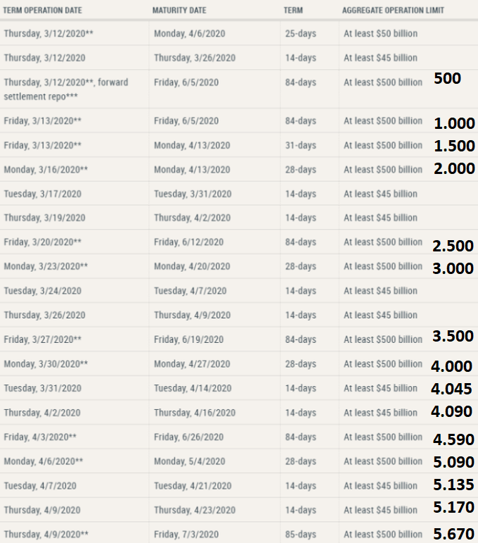 Bugünkü bazuka kararlardan sonra FED'in aylık #repo programı güncellendi. 4 hafta içinde FED bilançosuna girebilecek repoları alt alta bir toplayayım dedim. Bu kadar teminat getirilmesi imkansız ama $4.3 trilyon olan mevcut bilanço teorik olarak $10 trilyona vurabilir 😱