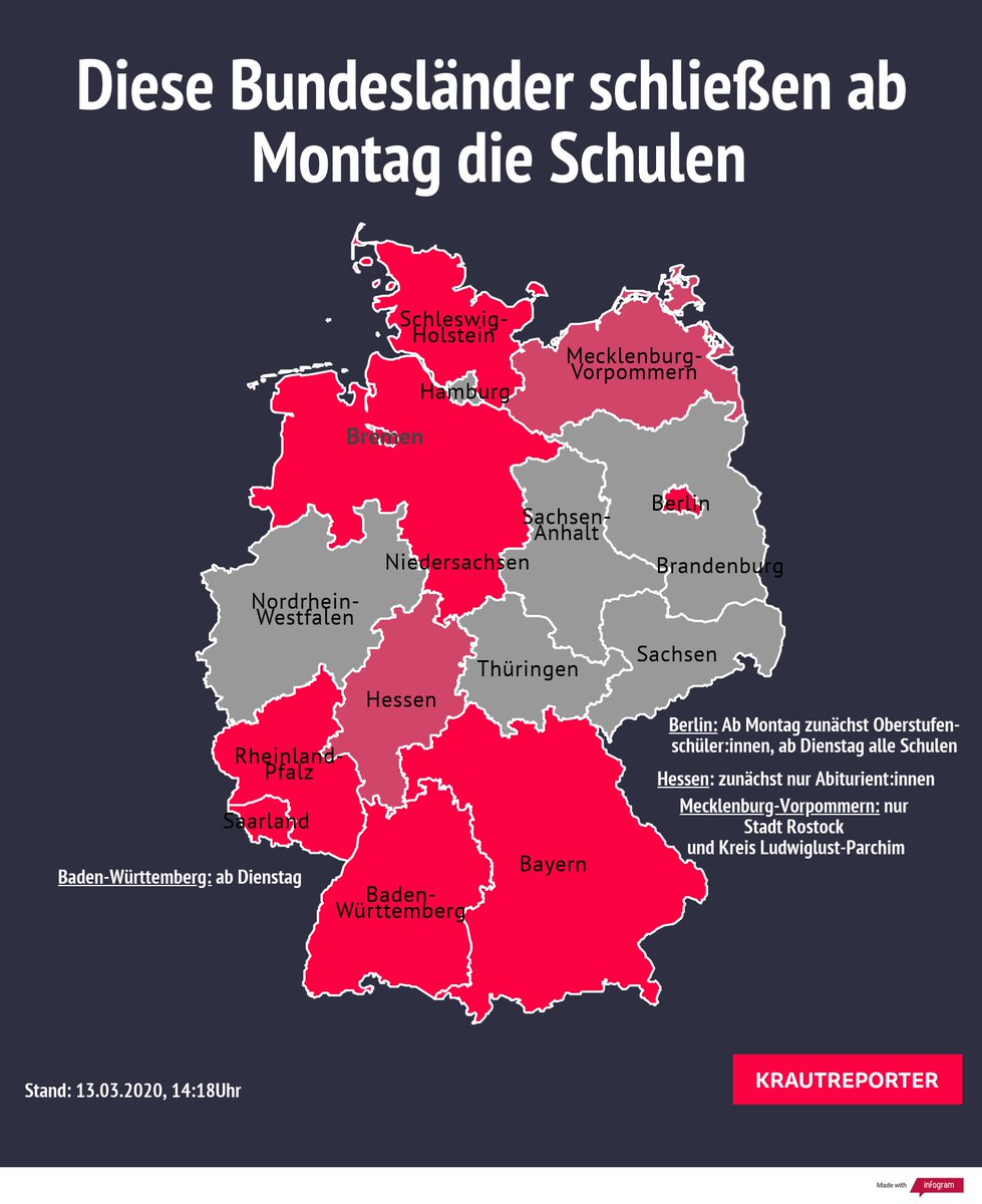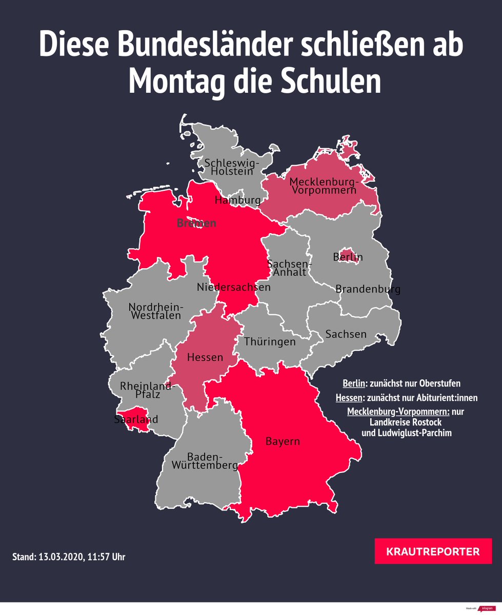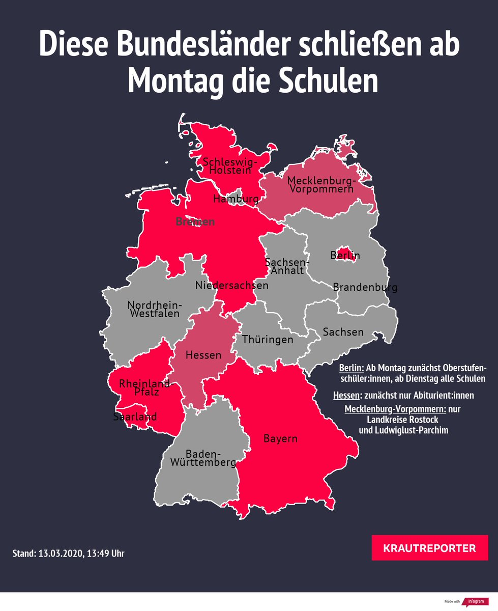 Diese Bundesländer schließen ab Montag die Schulen (Stand: 14:18 Uhr). Neu am Start: Baden-Württemberg – ab Dienstag. Aktualisiere fortlaufend. #Schulschließungen#coronadeutschland
