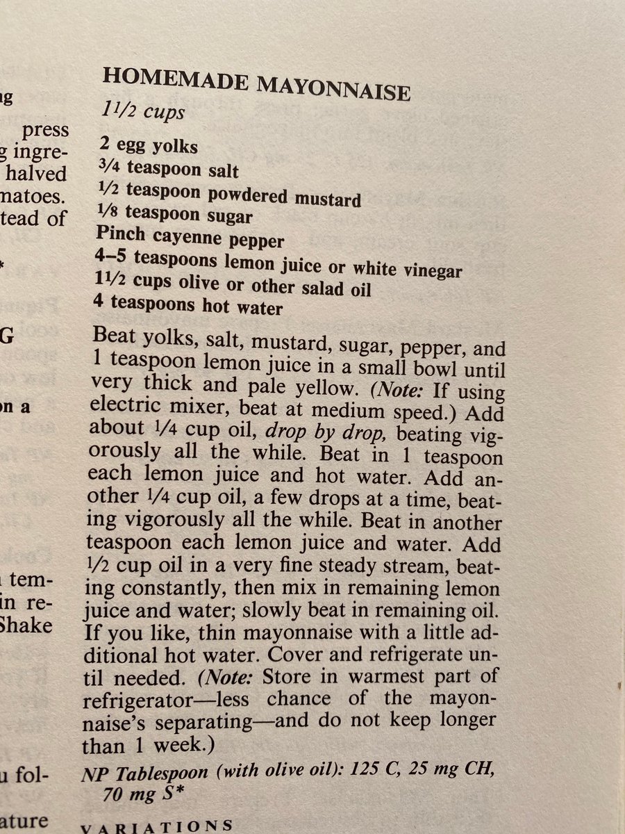 But let’s go culinary here - turns out there’s another fun thing you can do with fat and egg yolks. You can make mayonnaise (again, from Doubleday) 21/29