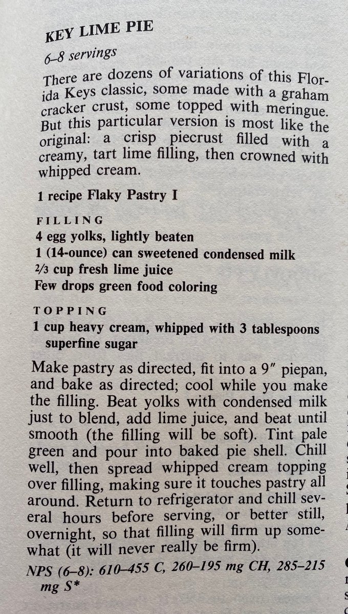 Here’s a recipe. Something fun about key lime pie is that it’s kinda new, as the history of pie goes - it’s missing from my collection of midcentury cookbooks (this is Doubleday) 2/29