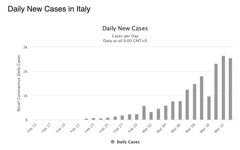 4/n Italy seems just to be at the start of the growth phase on the curve. It has even been adding a record number of cases daily. Note the data for 14 March in new cases is a staggering ~3500 which is 900+ more than yesterday's.
