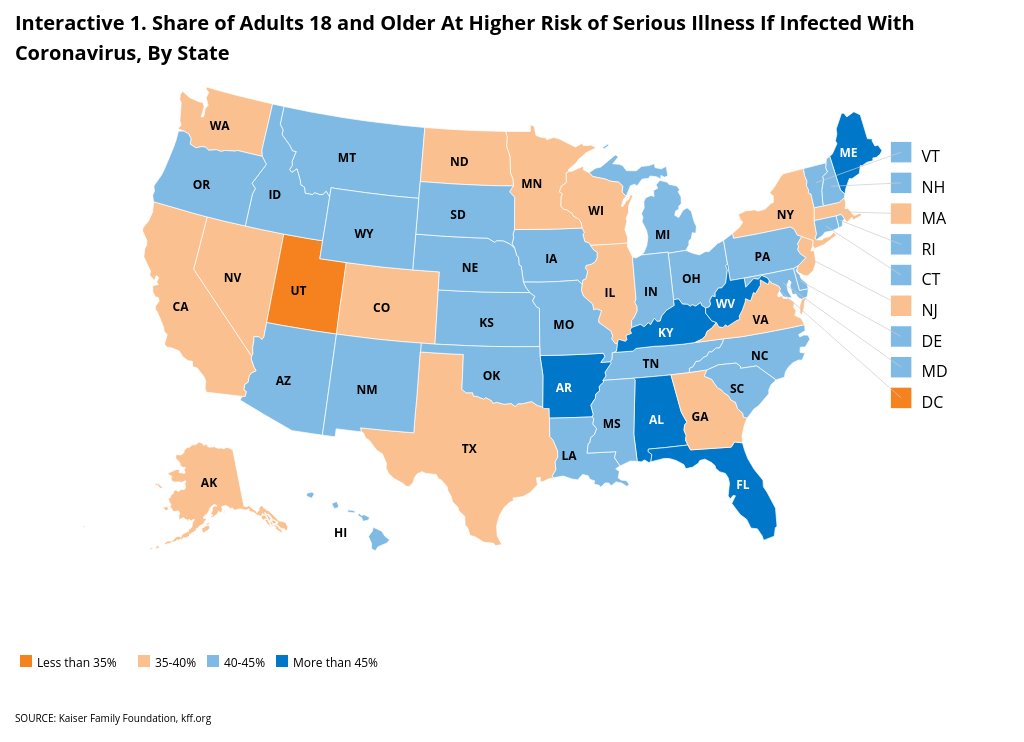 Kaiser Family Foundation @KFF study combined demographic risk with existing condition risk to estimate the states with the highest percentage of adults at risk for serious illness from covid-19