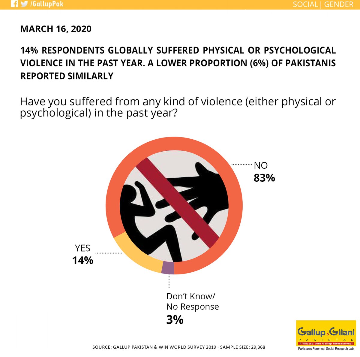 14% respondents globally suffered #physical or #psychological#violence in the past year. A lower proportion (6%) of Pakistanis reported similarly (Gallup Pakistan & WIN World Survey 2019)