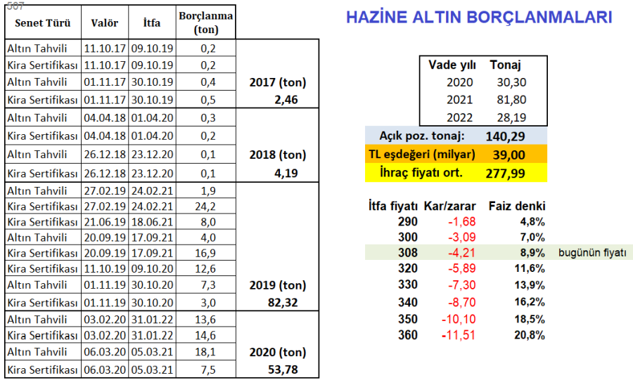 Borçlanılan 140 tonu itfa tarihlerinde geri alma fiyatı, bugünkü 308 TL/gr olursa Hazine 4,2 milyar TL zarar eder. Ancak çok düşük kupon ödendiği için 1,57 yıl üzerinden toplam maliyeti de %8,9 faiz ödemeye denk gelir yaklaşık. Fiyat çok artarsa, faiz denki de...🙌