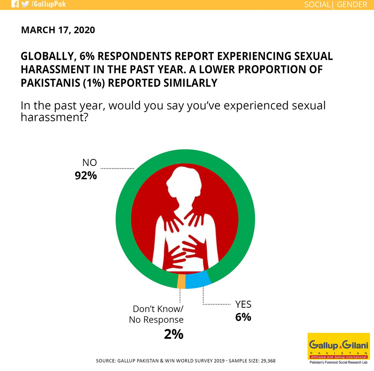 Globally, 6% respondents report experiencing #sexual#harassment in the past year. A lower proportion of #Pakistanis (1%) reported similarly (Gallup Pakistan & WIN World Survey 2019)