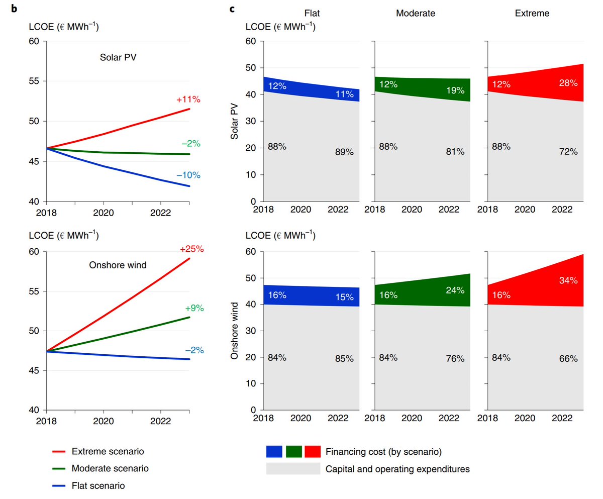 Thus, the cost of solar, wind, & storage (all capital, no fuel) are much more sensitive to borrowing costs. 3/7